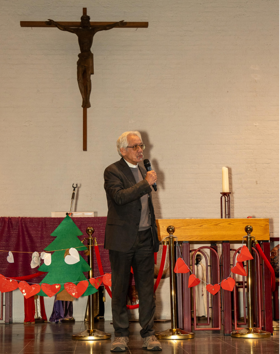 De liedjes werden afgewisseld met gedichtjes en de kerstboodschappen die de kinderen eerder hadden gemaakt. Tot slot vertelde directeur Marina de Blois het kerstverhaal dat werd voorgespeeld door leerlingen.’