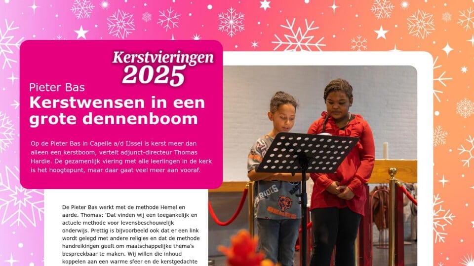 Op de Pieter Bas in Capelle a/d IJssel is kerst meer dan alleen een kerstboom, vertelt adjunct-directeur Thomas Hardie. De gezamenlijk viering met alle leerlingen in de kerk is het hoogtepunt, maar daar gaat veel meer aan vooraf.