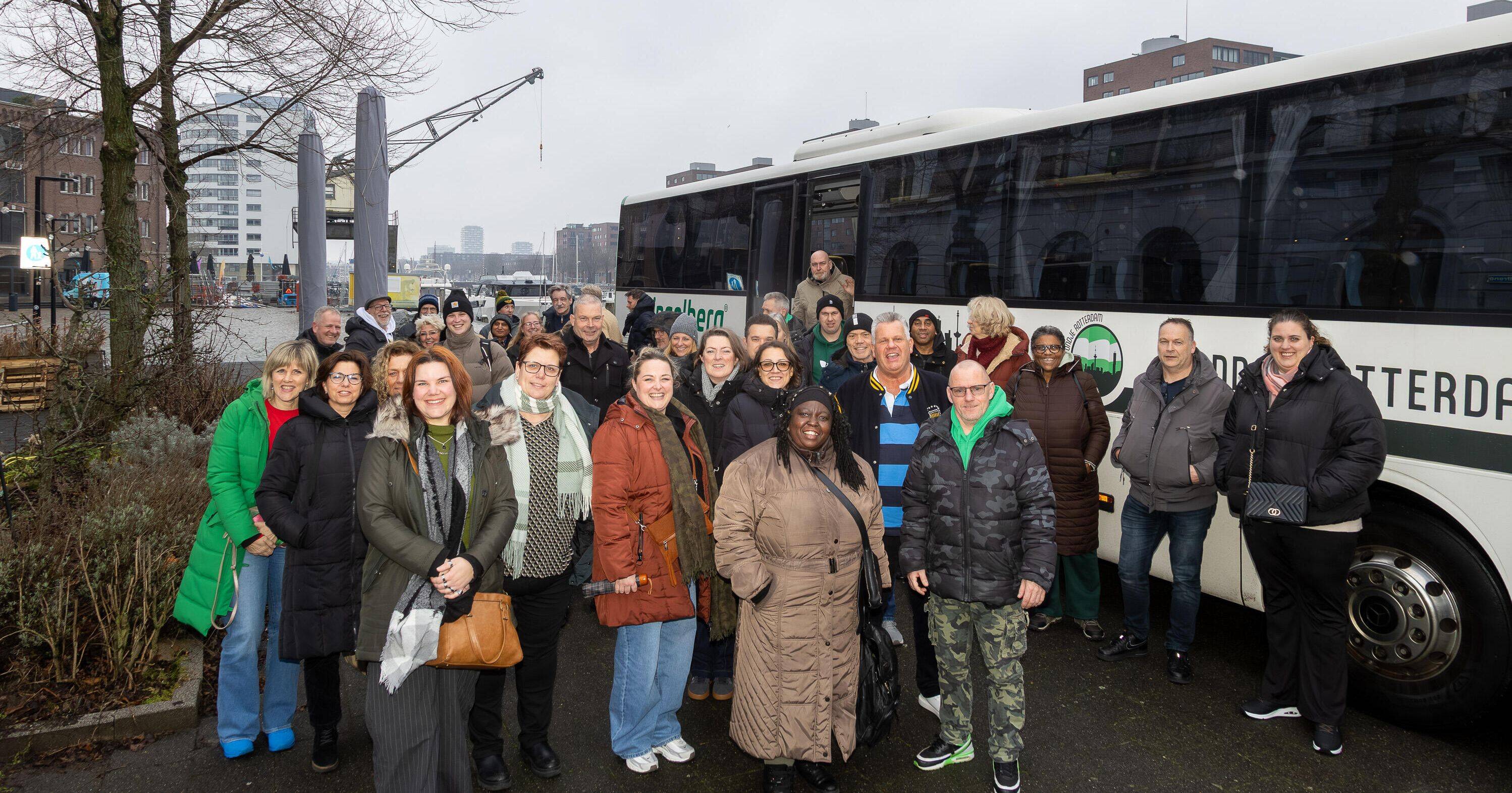 Aan het begin van de middag verzamelden zo’n 70 collega’s van verschillende RVKO-scholen, de Thomas More Hogeschool en de afdeling Huisvesting zich bij restaurant Okay bij het Entrepotdok in Rotterdam-Zuid. Na een gezamenlijke lunch volgde een ‘Rondje Rotterdam’: een bustour langs allerlei bekende en minder bekende locaties in Rotterdam, van vakkundig commentaar voorzien door de gidsen Roel Pot en Joris Lutz.
