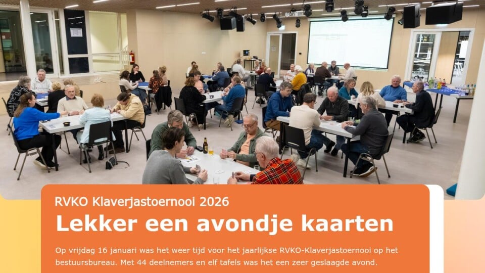 Op vrijdag 16 januari was het weer tijd voor het jaarlijkse RVKO-Klaverjastoernooi op het bestuursbureau. Met 44 deelnemers en elf tafels was het een zeer geslaagde avond.
