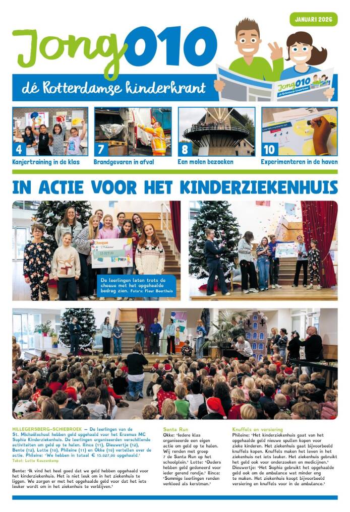 Op donderdag 18 december overhandigden leerlingen van de school een cheque ter waarde van € 15.027 aan de Vrienden van Sophia. Reden genoeg voor de krant Jong010 om daar in hun januari-nummer een artikel aan te wijden.