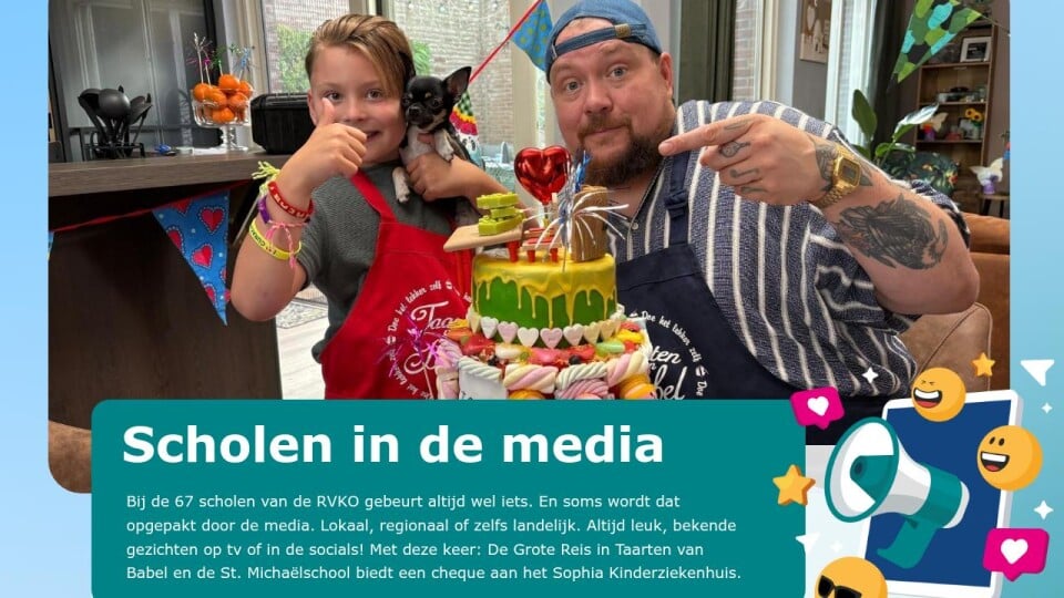 Bij de 67 scholen van de RVKO gebeurt altijd wel iets. En soms wordt dat opgepakt door de media. Lokaal, regionaal of zelfs landelijk. Altijd leuk, bekende gezichten op tv of in de socials! Met deze keer: De Grote Reis in Taarten van Babel en de St. Michaëlschool biedt een cheque aan het Sophia Kinderziekenhuis.